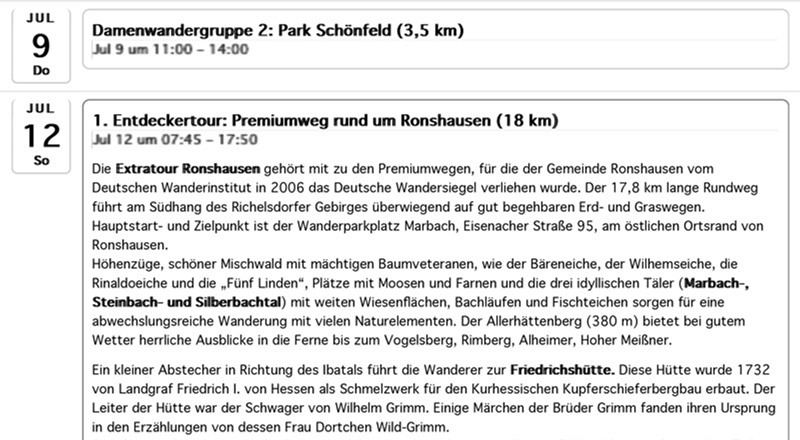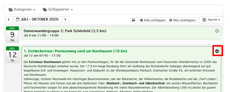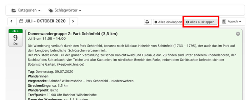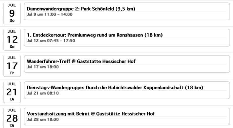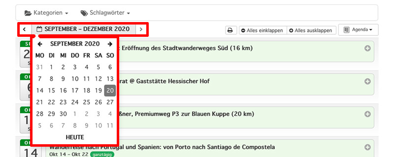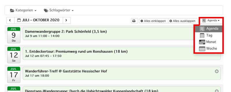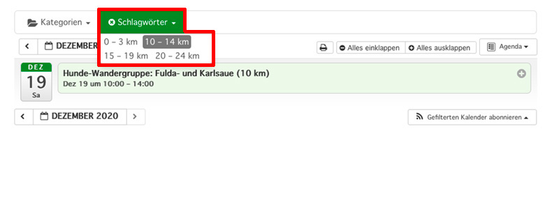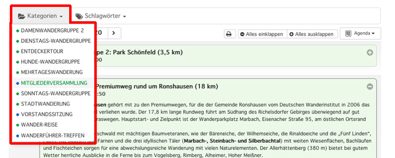 Sie können Sich nur bestimmte Veranstaltungen und Gruppen anzeigen lassen, z.B. nur „Entdeckertouren“ und „Sonntags-Wandergruppe“. Eine Auswahl mehrerer Kategorien ist möglich.
