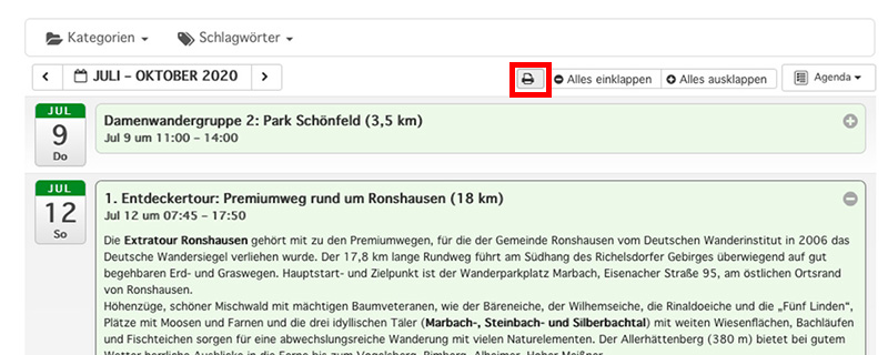 Die Liste lässt sich „eingeklappt“ genauso gut als Übersicht ausdrucken. Wenn Sie vorher die Kategorien wählen, die für Sie in Frage kommen, haben Sie die nächsten Termine immer im Blick.