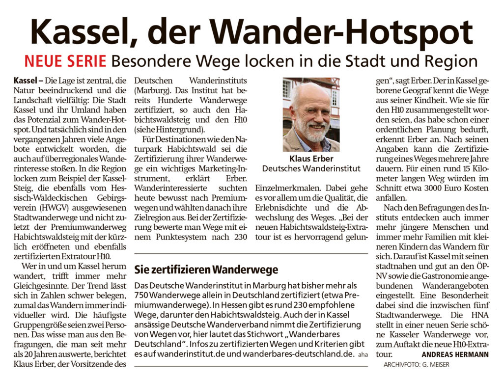 Kassel ist mit neuen Angeboten auf dem Weg zum Wander-Hotspot, titelte die HNA am 30. Juli 2025. Die Zeitung beginnt gleichzeitig eine Serie zu schönen Routen durch die Stadt und das Umland, die es unter Beweis stellen wird. Der erste Erfahrungsbericht führt auf die Habichtswaldsteig-Extratour H10.